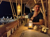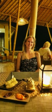 We walked back, tried the outdoor shower and then walked to Pearl Beach Lounge to have dinner. That salmon was incredible. So was the pina colada and steamed brownie. Wow! And the mouse falling from the ceiling, passing out until the waiter shoveled him up and went downstairs and he darted away, was crazy! The evening was pretty much as warm as the day and nothing else than a thin-striped dress was needed while eating outdoor. What a place! We’re in love. And I think I can speak for Mikael as well. I already feel that 4 nights and 3 days here won’t be enough…