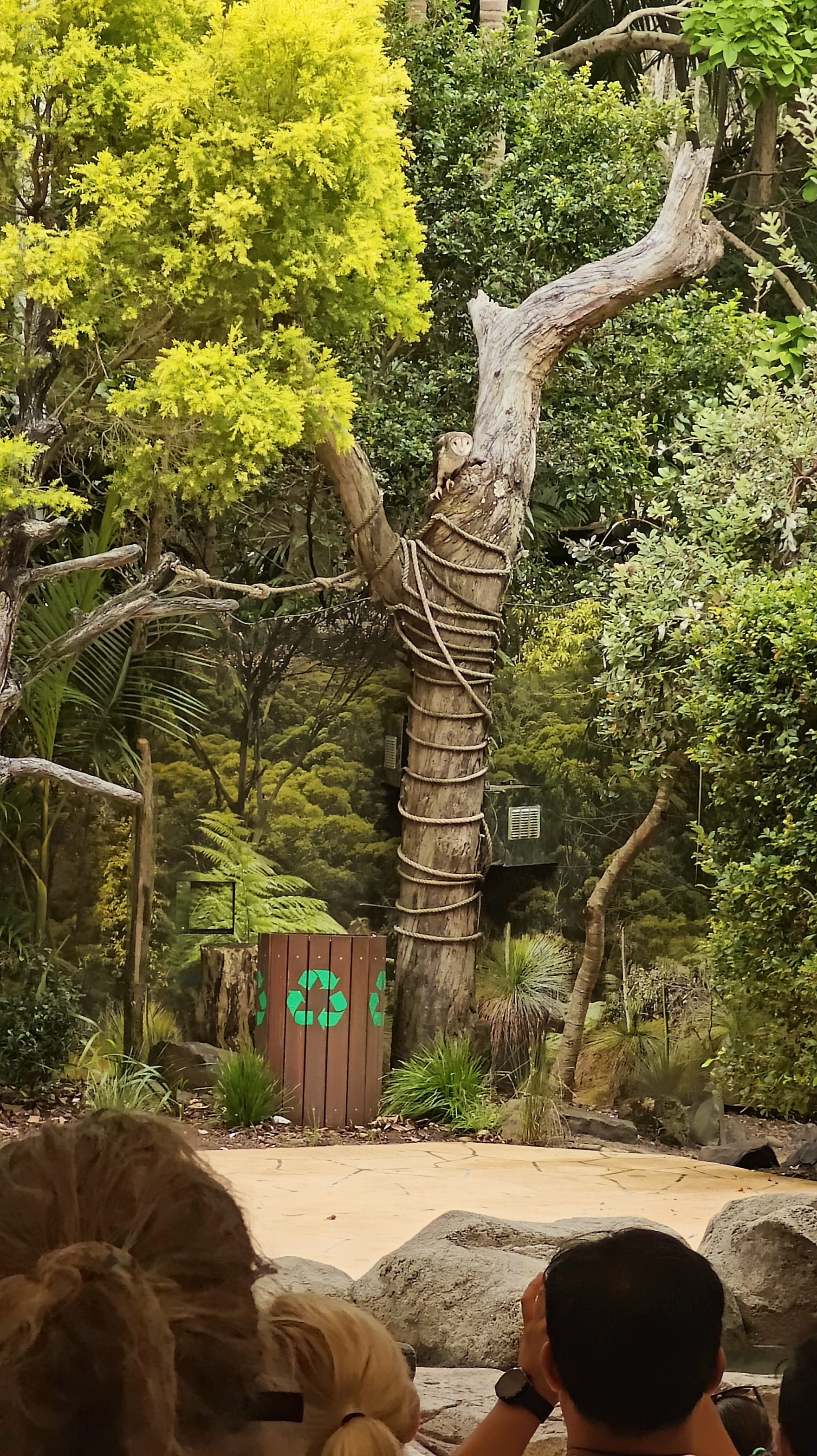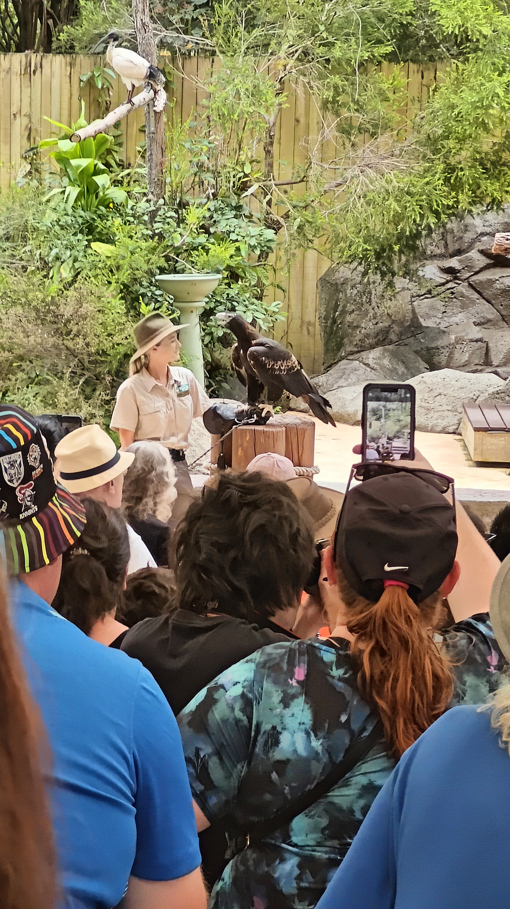 The WildSkies show including birds is really informational with engaging staff talking about the importance of keeping Australias skies healthy and showing off some really incredible birds, including the beautiful Red-Tailed Black Cockatoos and huge Macaws as well as Australias largest apex predator the Wedge-Tailed Eagle, which was a bit shy today. We were fortunate enough to see it more the first time we went, but this time it only flew across the audience once, mostly because something else was flying around in the area.