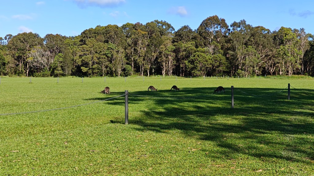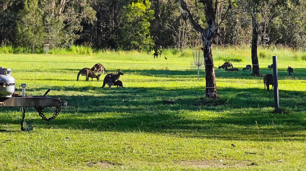 We were woken up by the evil laughter of a full hoard of kookaburras. It really sounds like an evil laugh and there were so many, several times. We went back to sleep and I was so surprised when we actually woke up for real at like 5:30am and saw some kangaroos jumping around just outside. After walking around the campground, we saw 30 more and so many joey’s. I will never get tired of seeing them poking their cute little heads out the pouch curiously.