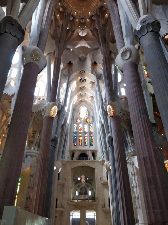 First of all, this is a basilica under construction, it is at the end and about to be finished (in hopefullt 8 years when Gaudi, the architect of the thing, has his 100th anniversery of his death). The construction started in 1882 and I think Gaudi had it all planned out from the beginning. I think he must have had some type of obsession disorder or something. Because he thought of everything! He loved nature and the whole church was inspired by it. From the outside that can be seen from the big cyrprus tree over the current entrance (it won’t be the main entrance when it is finished). The inside is supposed to look like a forest and you definitely get that feeling when you are inside. The arches of the basilica are very high up and in order for the biggest tower (which isn’t built yet) to hold, the pillars are made from different stones to hold better, but they are also divided at the top to take more weight. Resembling branches of trees. It is so beautiful!