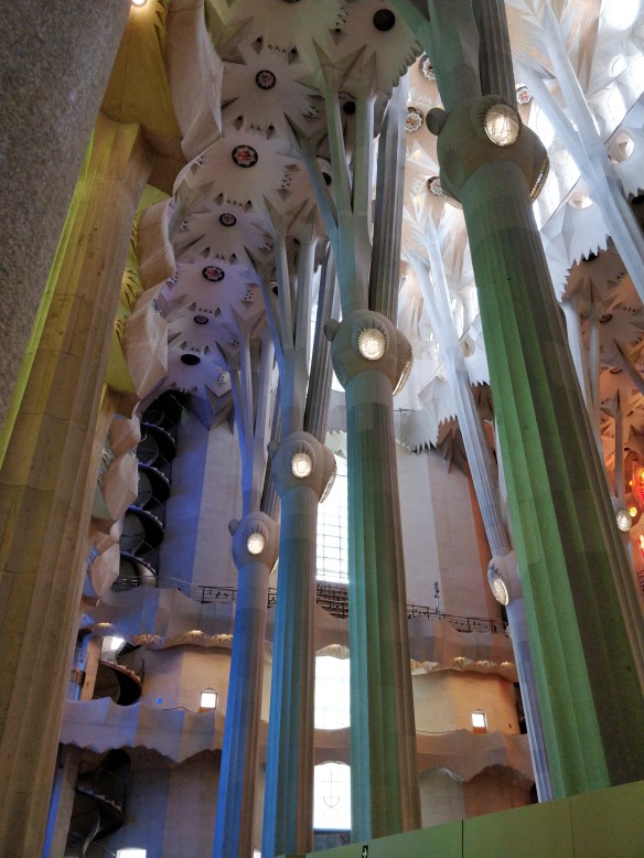 First of all, this is a basilica under construction, it is at the end and about to be finished (in hopefullt 8 years when Gaudi, the architect of the thing, has his 100th anniversery of his death). The construction started in 1882 and I think Gaudi had it all planned out from the beginning. I think he must have had some type of obsession disorder or something. Because he thought of everything! He loved nature and the whole church was inspired by it. From the outside that can be seen from the big cyrprus tree over the current entrance (it won’t be the main entrance when it is finished). The inside is supposed to look like a forest and you definitely get that feeling when you are inside. The arches of the basilica are very high up and in order for the biggest tower (which isn’t built yet) to hold, the pillars are made from different stones to hold better, but they are also divided at the top to take more weight. Resembling branches of trees. It is so beautiful!