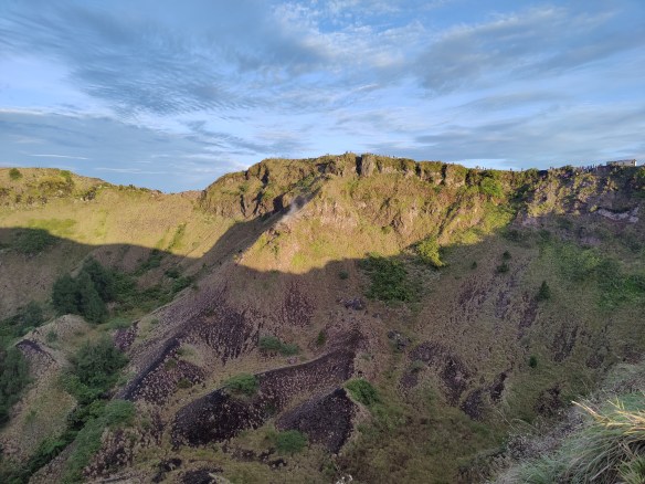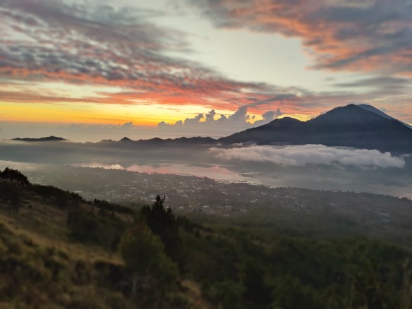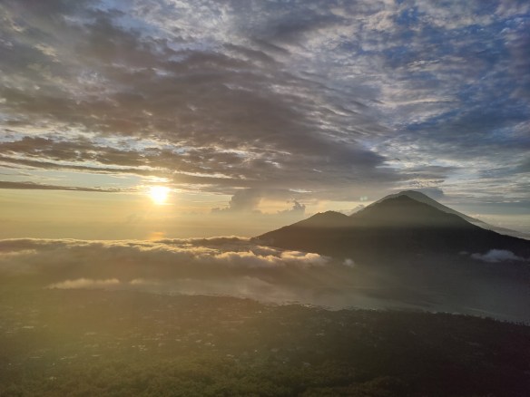 Up there, we had steamed banana sandwhiches which was surprisingly good. We watched the sun rise next to the other two mountains on Bali. Can’t remember their names.