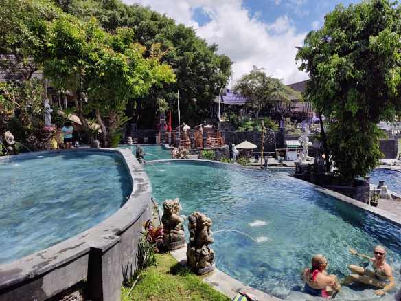 Right after the hike, our driver took us to Batur Natural Hot Springs. At first we thought it was weird to go to hot springs on Bali, but we withdrew those thoughts immediately. It was like a spa facility, with many pools and very warm water outlets. The water was warm, but those were really warm and great to ease the shoulder muscles. We only stayed for an hour and a half, and I probably would have wanted to stay longer. It was incredible. At the bottom of the big crater, right next to the lake. So worth it after that hike.
