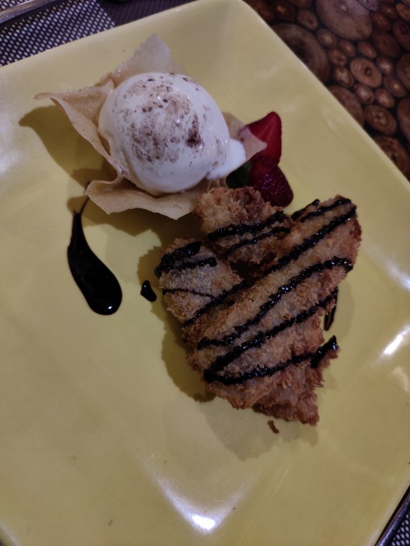 Back at the hotel, we were so tried that we fell asleep for an hour before we took a dip in the pool in the still drizzling rain. And then we decided that it would be worth going out for a real dinner our last night here in Ubud. So we called a taxi which took us to Teba Sari Resto, which was a restaurant in Ubud close to a Koi pond. It was a bamboo construction and the pond had huts with tables in them. We didn’t get a pond table, but we still had a nice view. We tried fried duck and friend banana for dessert. Their drinks, Mango Berry and Cosmo Colada, were really good as well.