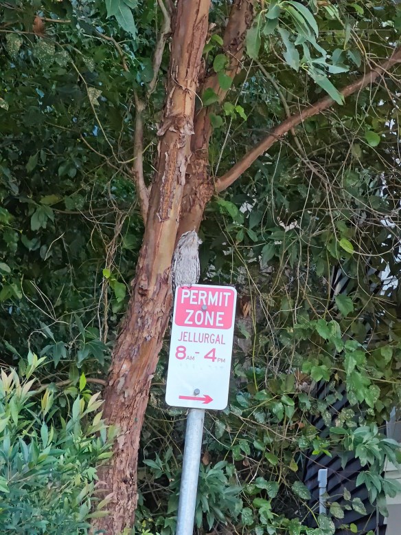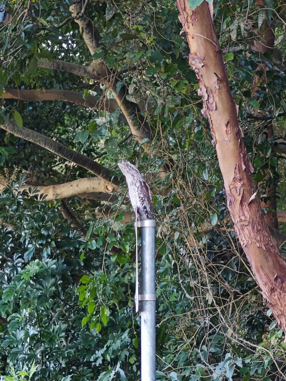 Before we even came to the park, we saw a sleeping frogmouth owl on a sign. It slept with its head up. I think this was the first one we saw, unless the big owl we saw one evening on our first week here in a tree 2dm above our heads was one. It probably was a frogmouth as well.