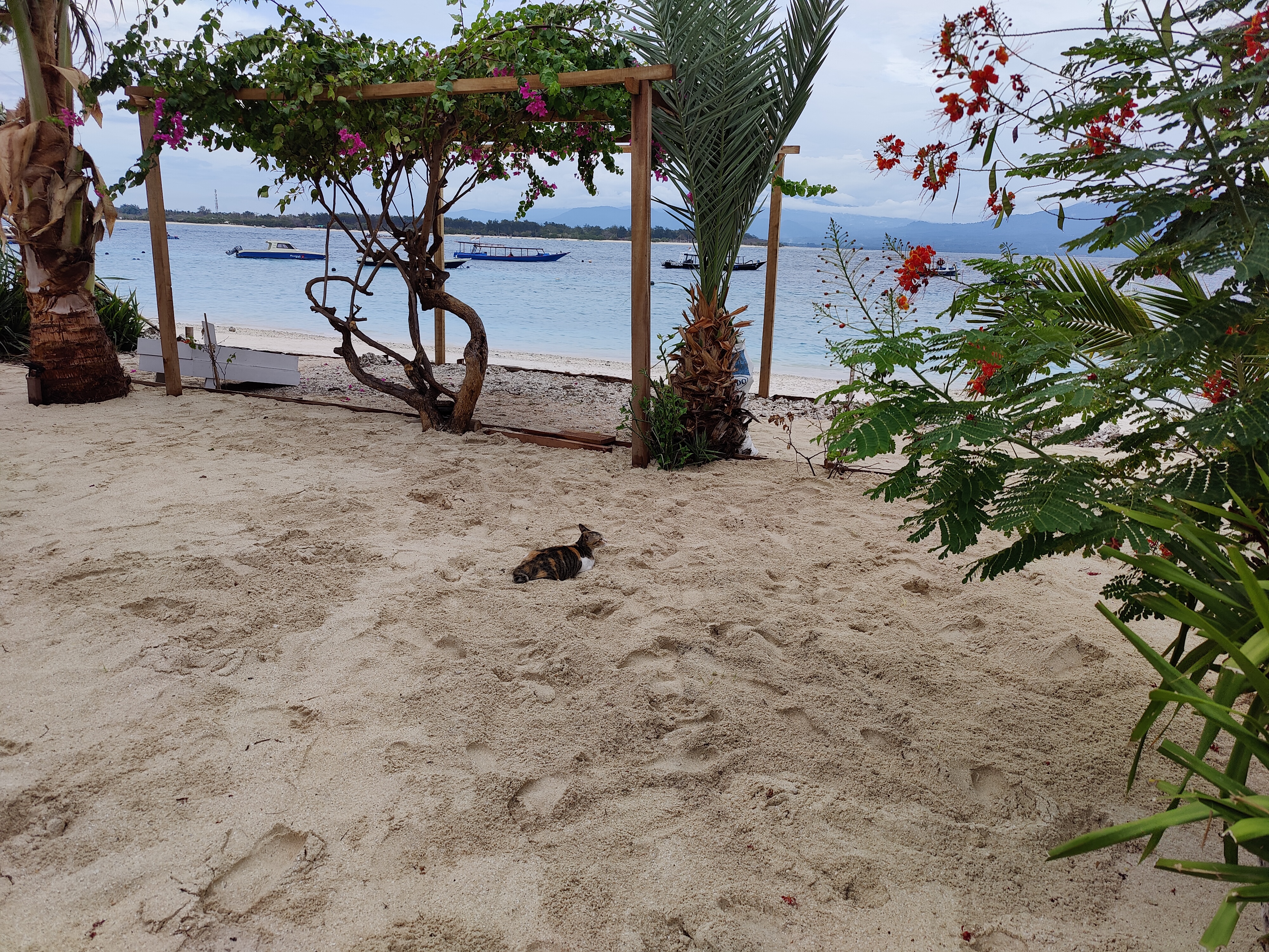 What was not so much fun, was that after our second to last drop off at Gili Air, it started to pour. The AC was maxed in the boat and looking out at the grey wet was not nice. But honestly. When we got off the boat, it was the best rain I’ve ever experienced. It was still 28C something and the rain was really warm. I loved it!! So walking to the hotel was not too bad at all. And definitely not when the horse-drawn carriages ran past. So what’s pretty cool about this island, is that they don’t have any vehicles except bicylces, the occasional electric moped and several horse-drawn carriages. They all wore bells and it sounds lika Santa’s reindeer sleigh is coming when they are near. So cute!