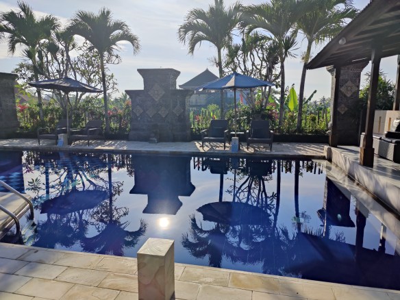 Our last day on Bali lasted until 3pm when we were picked up from the hotel. We didn’t do more than sleep a little longer than usual, eat breakfast, pack, check out, and hang out by the pool. But it was still more than just leaving for the airport right after breakfast. It was a beautiful day, clear blue sky with a breeze so it wasn’t too hot. A really nice last half day.