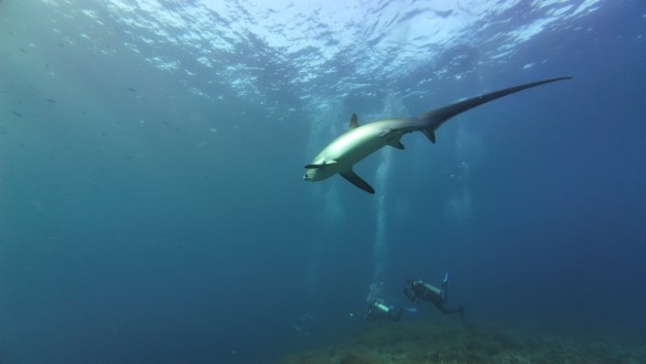 We were first at the divesite, the waters were so calm, the visibility a refresh sight after yesterday’s extremely bad visibility at Deep Rock. Not too many thresher sharks at first, and the same goes for divers. But at the second dive, there were many more of both. I had some sharks swimming real close to me this time. It was incredible and I got it all on video! Unfortunately on my GoPro Hero 4, which is ancient compared to Mikaels’s DJI Osmo Action 4. I’m still excited to see the results when we have time to go through it all (once we get back home).