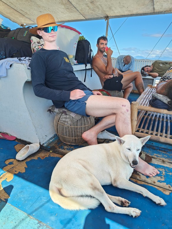 The trip back to Malapascua took around two hours. Everyone was so tired and most people slept. I read! Mikael slept and had a company in the form of the owner’s big wolf-like dog, Galaxy. It was so cute when they were sitting together.